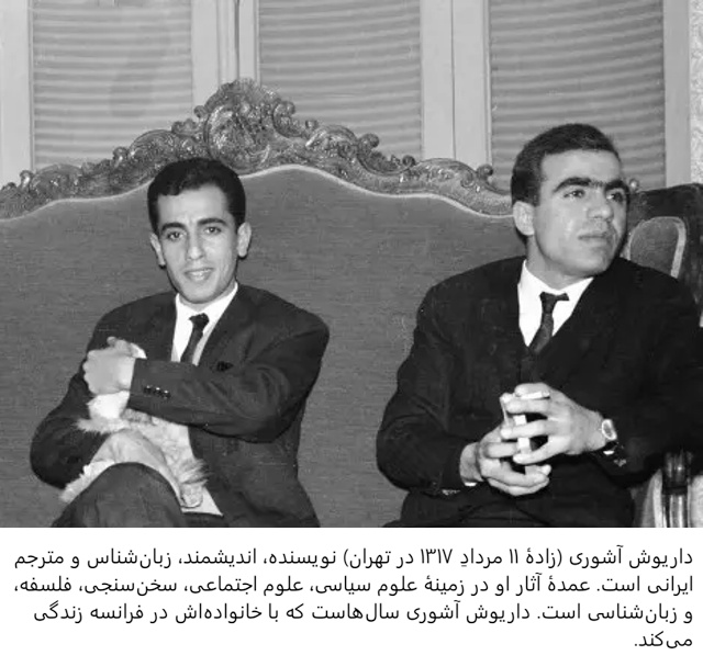 Ashouri’s extensive writings and translations cover a broad range of subjects, and some recent publications include Ta’rifha va mafhum-e farhang (Concept and Definitions of Culture), Erfan o rendi dar she’r-e Hâfiz (A hermeneutical study of the mystical views of Hafiz the great Persian poet), Mâ va moderniyat (a collection of articles on the cultural crisis of Iranian society facing with modernity), and Farhang-e ‘olum-e ensâni (English-Persian Dictionary for Human Sciences).